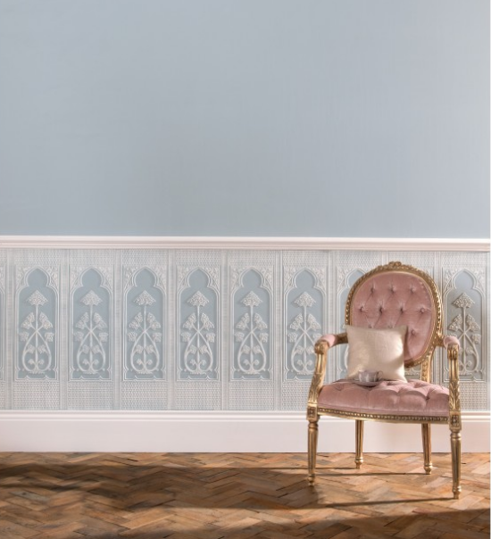 Thorough preparation of the surface is essential when installing Lincrusta. Remove old paper, wash down, fill all imperfections and allow to dry. Rub down before applying a coat of size.