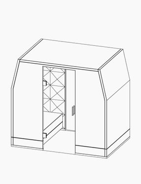 The Home Meeting models are equipped with an 82 cm wide glass door with stainless steel fittings. The 82 cm wide window is opposite the door. The two panels next to the window have a pyramid-shaped 3D foam. Home is made of upholstered panels and is placed on a black, 4 cm high wooden plinth.