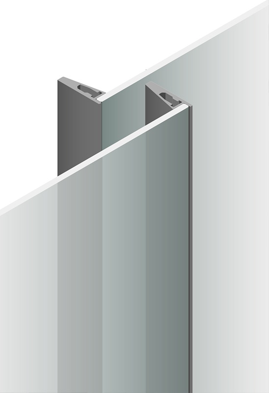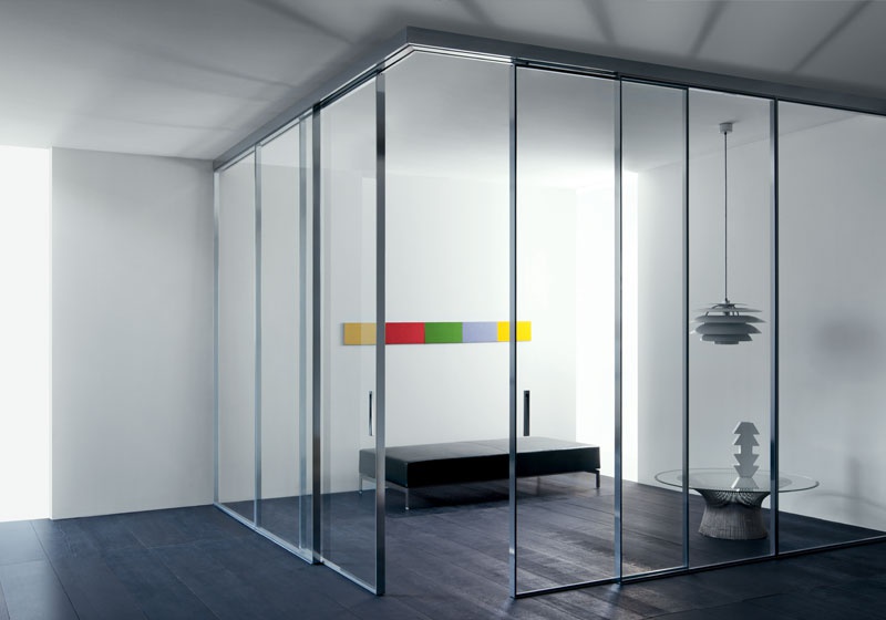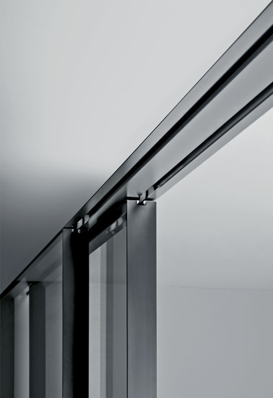 Sliding system with aluminium frame 50 mm thick and tempered glass 6 mm thick.