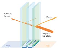It is based on the directly transmitted solar energy and secondary heat radiation following absorption. The energy falling on the glazing varies dependent on the position of the sun. The higher the g value of a glass, the higher the solar gains are and the resulting building warming on sunny days. A low g value is therefore particularly important for large glass facades to prevent rapid overheating of the rooms.