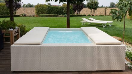 The Playa Twin mini-pool can be supplied, as an option, with the Playa Twin cushion which makes the product true outdoor furniture. The Playa Twin cushion can be placed over the two technical steps to sunbathe by the pool, or it can complete the relax sunbed by making it even more welcoming.