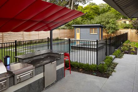 The creative colour combination proves that less is more. Pops of vibrant red throughout the landscaping provide lots of energy and personality. Whether the sun is east or west, the cook is always protected.