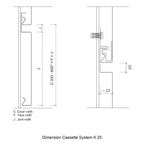 This type of cassette facade is based on the RHEINZINK horizontal panel. The cassettes have an installation depth of 25 mm, they are completely separated in the vertical axis and are clipped into concealed fastening elements (RHEINZINK fastening rail). The width of the horizontal shadow gap can be varied (20 mm to 30 mm). The vertical joint can be flush with the horizontal joint or recessed as a shadow gap.