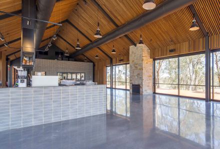 Designed by Studio Nine Architects in partnership with Frame Creative and built by Woolcock Construction, Lot 100 Cellar Door creates a warm and inviting atmosphere through natural materials and quality craftsmanship.