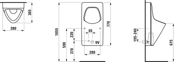 Siphonic urinal, internal water inlet, with flushing rim, with electronic control, battery operated (9V)