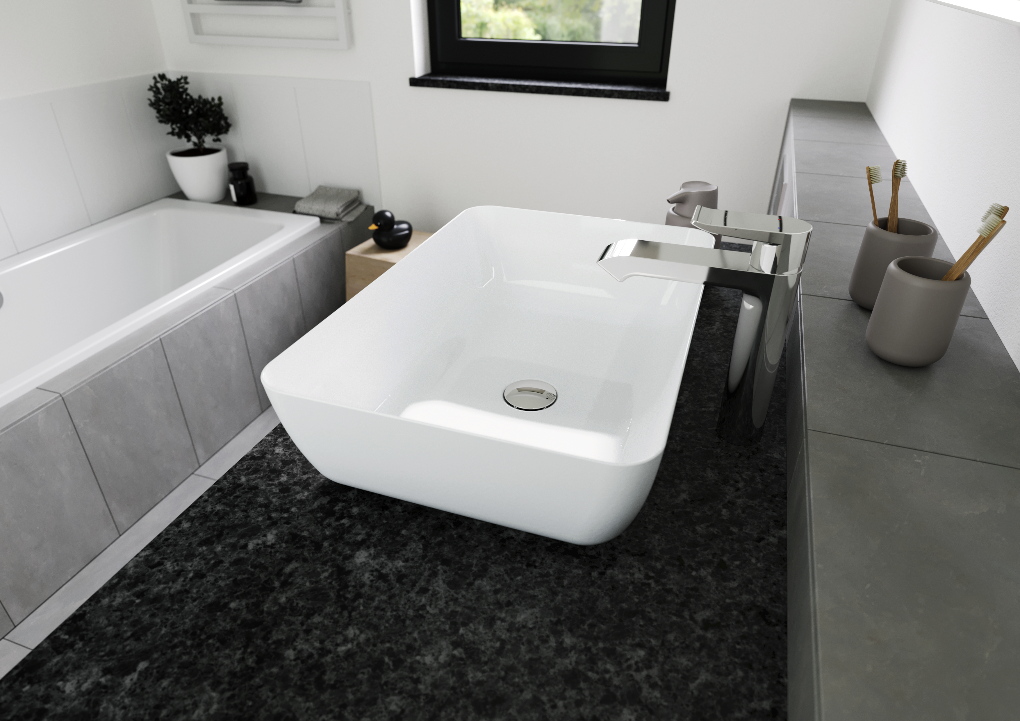 The CAYONO washbasin combines puristic aesthetics with intelligent functionality: Developed for the designing of modern bathrooms, the washbasin impresses with its clear lines, which are rounded off by softly curved contours.