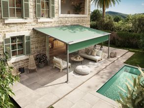 The pergola awnings impress with their stable construction. This makes them particularly suitable for large areas. Thanks to the lateral fabric guidance, they offer optimal sun and weather protection up to a wind force of 6. In addition, they can be equipped with many extra options such as wind and privacy protection, light or heat radiators.