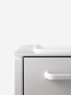 All three available Vipp bath modules are fitted with a durable tabletop with an integrated sink. This bath module has one sink and one large drawer. Vipp bathroom tap is included.