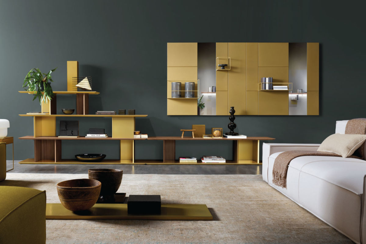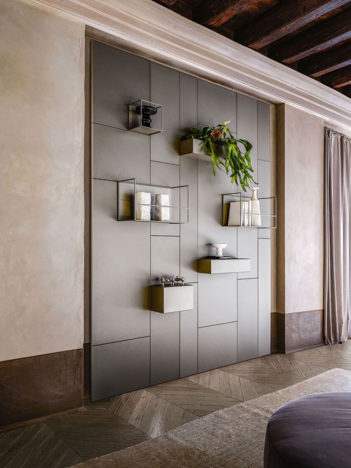 The magnetic shelves, made of painted metal, can be freely positioned on the wall panels to create aesthetically and functionally evolving compositions.