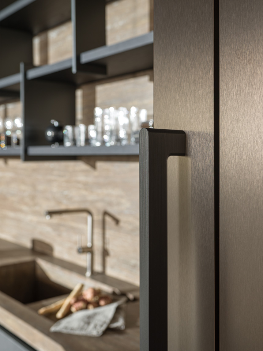 In Yabu Pushelberg’s interpretation, the inside is extraordinarily scenographic, above all thanks to the configuration of the “amphitheatre” bases, where the curved marble or stone worktop and the sloping terminal bases give the kitchen an unusual sense of space. The marble-covered back panel acts as the theatrical wing and features an unconventionally designed set of shelves, left open to show what is needed. Innovative is also the design of the new handle YP.