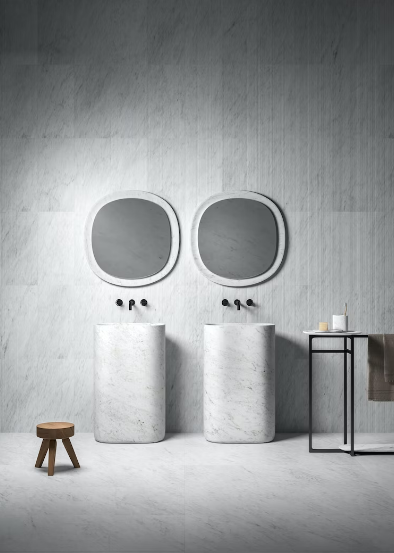 Available in Bianco Carrara, Crema d’Orcia, Pietra d’Avola, Gris du Marais® and Silk Georgette. The Anima freestanding basin is compatible with freestanding and wall-mounted tapware.