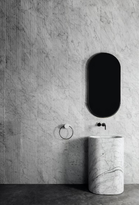 A solid column of natural stone, with the top area carved out to create the soft curve of a basin, this is a truly sculptural piece which brings elegance and sophistication to the bathroom.