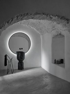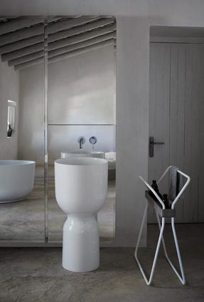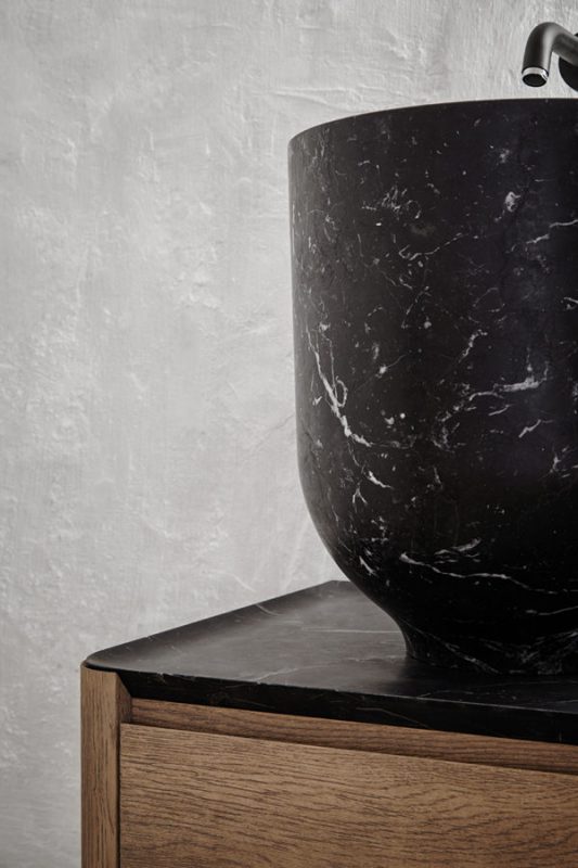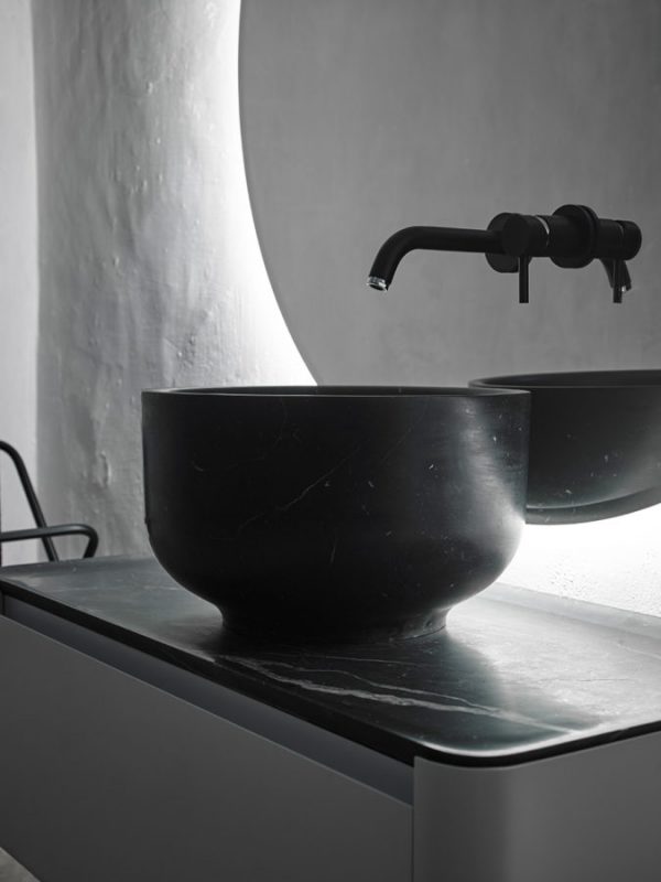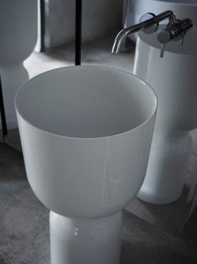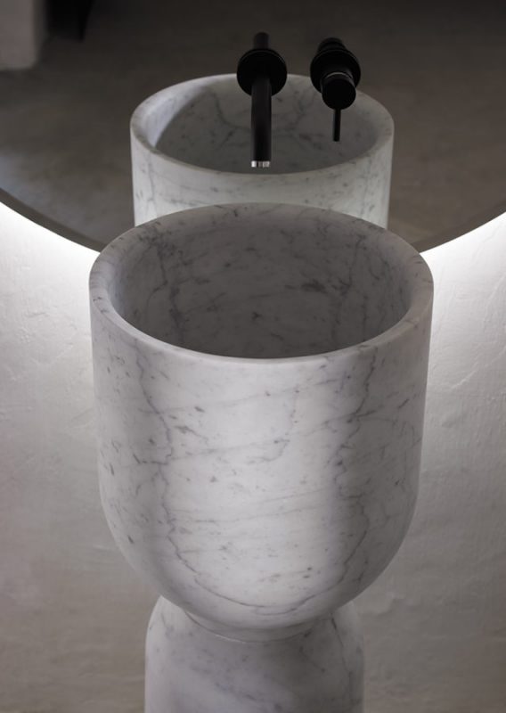 Collection of freestanding with totem and/or top mounted washbasins in marble or matt solidsurface with possibility of applying the UHS colour coating in 60 colours.