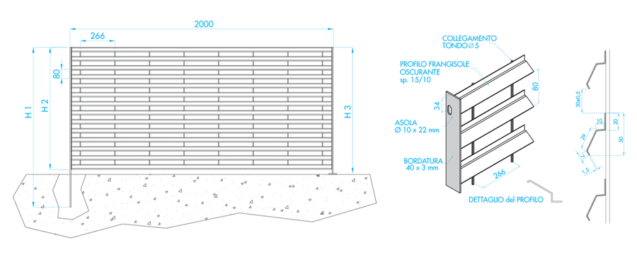 It is characterised by the special horizontal texture of the bearing bars and the sunbllind profile, which leave enough space between the bars, making it particularly suitable for protecting and enhancing design environments and green areas with an excellent architecture. Item specifications