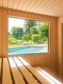 The TORNI sauna can be expanded with various glass and window elements, such as a panoramic window. Beautiful views are thus guaranteed.
