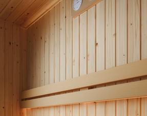 A large front glass and an emotional backlit bench characterize this made to measure sauna, available in Finnish, bio or infrared version.