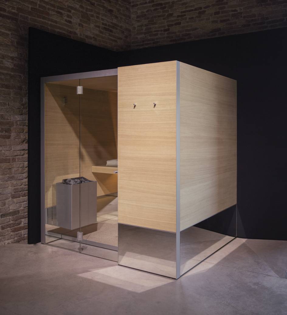 A platform covered in grès porcelain, which looks a bit like a flying carpet, can be installed inside, allowing the sauna to blend in with even the most sophisticated living areas, giving it a light and airy feeling.