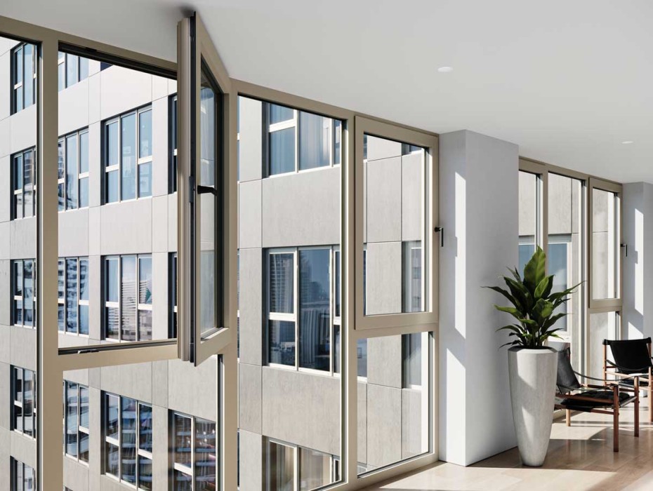 The outer appearance of the window, its invisible sash ideally emphasizing the slim face widths of the system, and heat insulation values of Uf 1.0 W/m²K (standard average) meet highest architectural and energetic requirements.