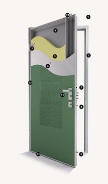 -Subframe made with 20/10 thick galvanized steel with 12 anchors to wall -Frame made with 20/10 thick galvanized steel, painted brown Ral 8017 and complete with plastic covers, gasket and footers -Adjustable hinges on 3 axes with brown hinge covers -Doorleaf made of one galvanized steel sheets16/10 thick. Gasket in the perimeter of the leaf -Inner reinforcement spar -Thermal and acoustic insulation with rock wool (density about 120 kg/m3) -2 panels made of polyester fibre, placed in the locking system area, all along the bars -Wide-angle peephole -Security locking system with core with European cylinder with 1 master key + 5 keys with card equipped with a hardened steel drill-proof plate. Patented Rolly defender, drill-proof and dust-proof