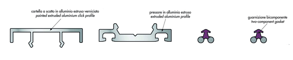 Special extruded aluminium profiles with gasket used as architectural and connection elements with the other components.