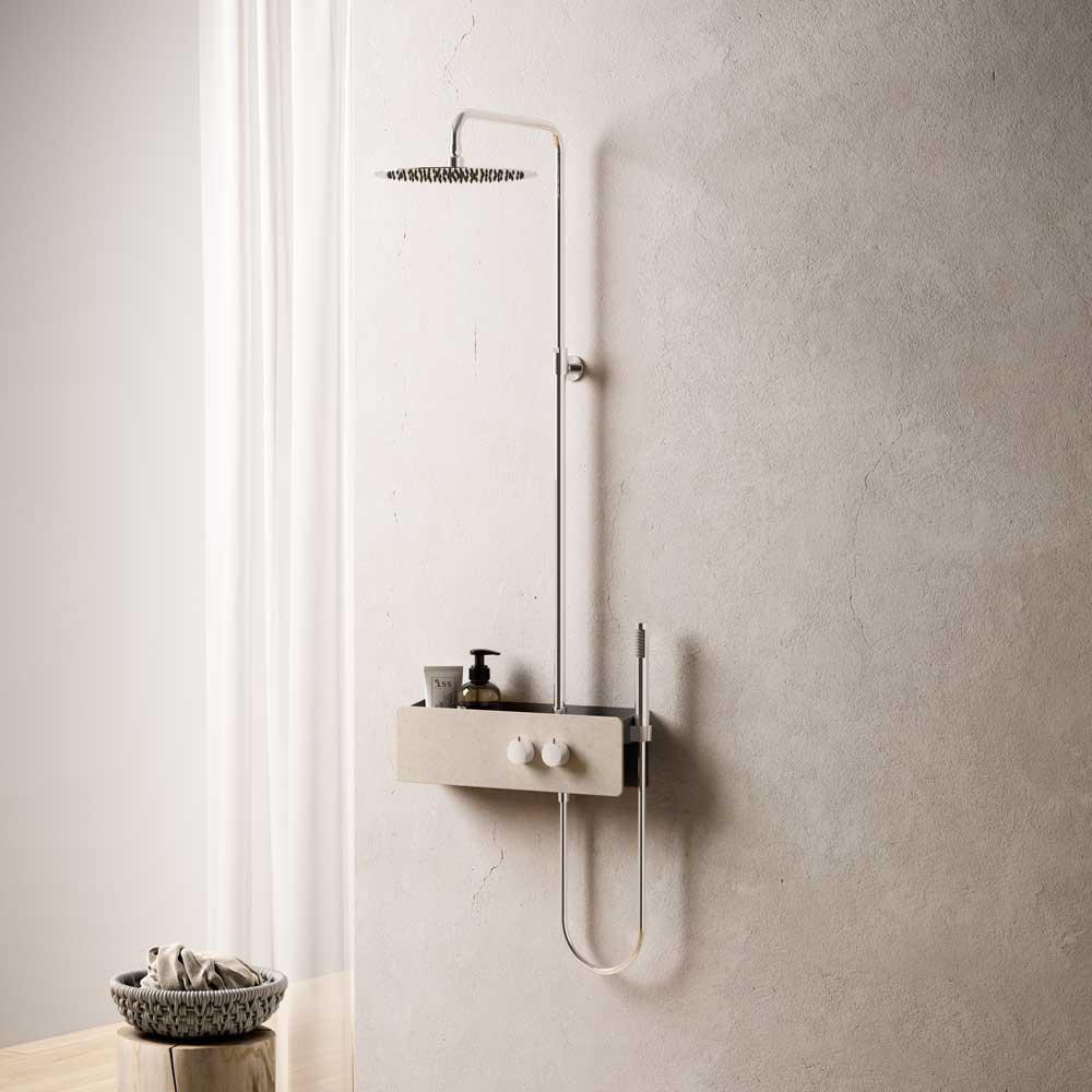 Shelf equipped with: thermostatic mixer and diverter, handshower with fixed holder, adjustable and directionable shower column with round showerhead diam. 300 mm. Case in painted steel, charcoal grey colour. Front cover in coloured glass or in natural stone effect finish.
