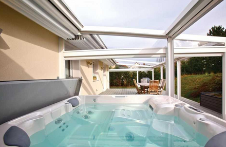 -Side closures with vertical screens, sliding glassdoors or sun shade panels- LED lights integrated in the canvas tubes Anemometer and rain sensor