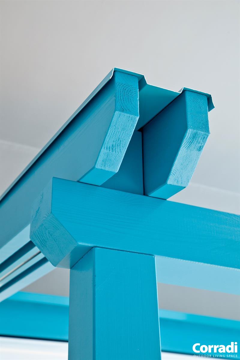 Equipped with a front gutter in the sloped version, this pergola attached to house is also guaranteed by the CE mark and can benefit from the 50% Ecobonus, a tax deduction provided for solar shielding to Italian taxpayers. A wide range of classic colours provides ample possibilities for customisation of the structure: grey and anthracite, white and ivory, but also brown and timeless chestnut.