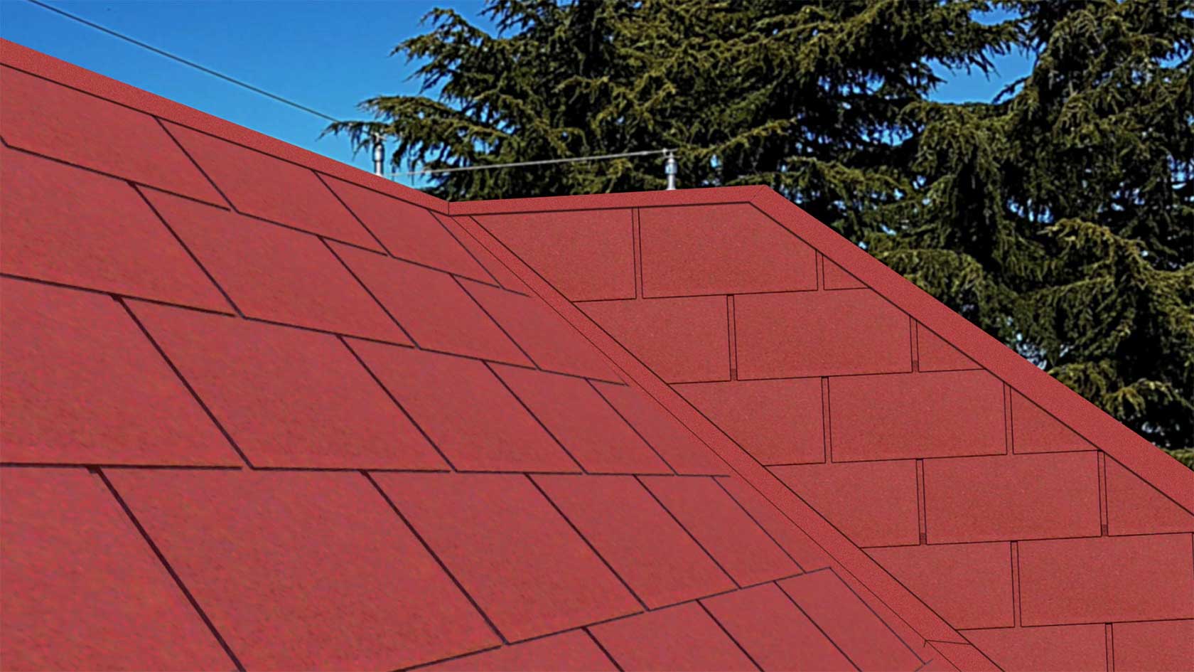 Supply and laying of a roofing cladding in tiles in IOROI aluminium thickness 0.7 mm. The tiles are fixed directly through hidden stainless steel screws on a wooden support. The tiles are 375×245 mm and are installed on a minimal pitch of 25°, in a number of 11/m2. Flashing accessories and special elements are not included.