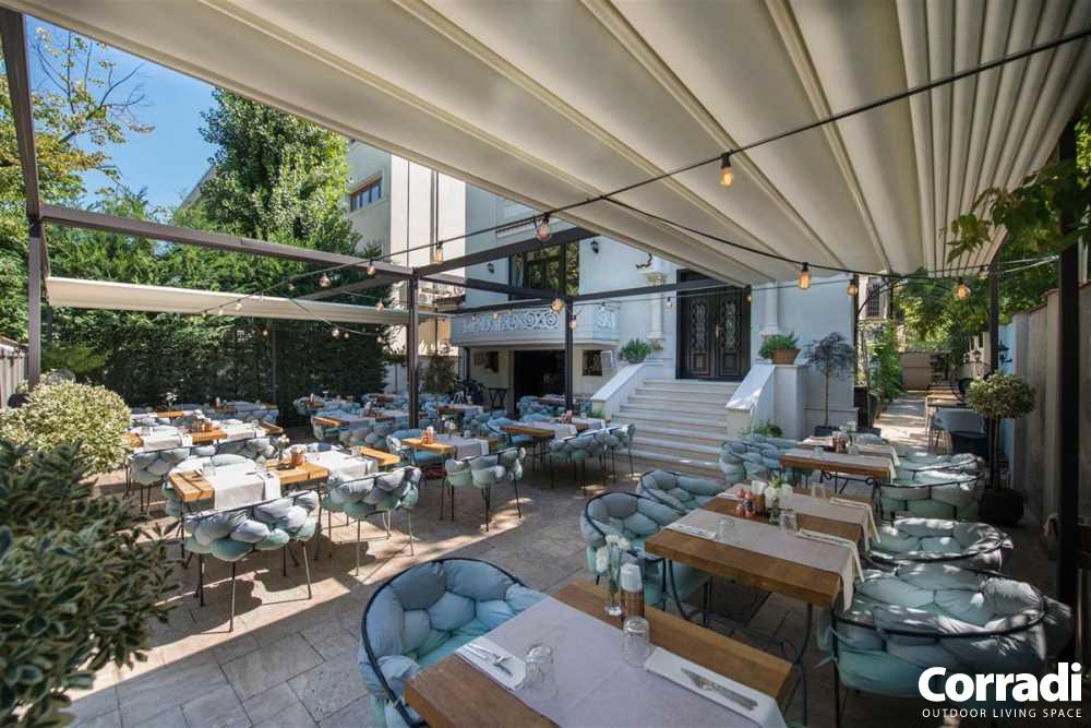 The standard canvas is slack and allows the draining of water to the ground even without a slope, while the mechanical movement is hidden from view because it is situated inside the beam made with an innovative aluminium profile, for an openly minimalist and trendy design. This model of Corradi Pergotenda also boasts many possibilities for customisation.