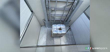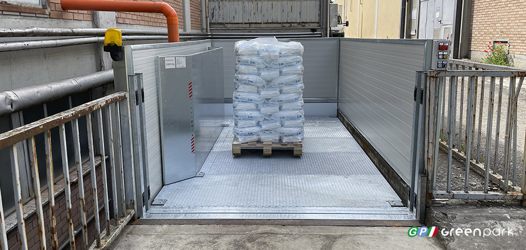 Freight elevator with single column platform, designed for the transport of goods with defined stop levels. Also certificate for driver on board.