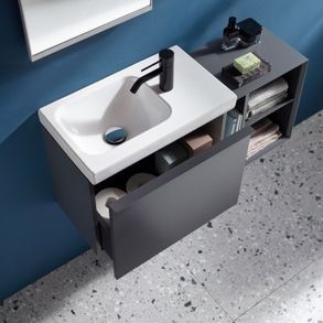 The washbasins are specially designed for small bathrooms or guest WCs. They offer a whole host of solutions for when space is at a premium. Shelves and tap holes positioned to the side enable low installation depths, and corner constructions mean that installation in niches is also possible. The ceramic range is complemented with WCs with shortened projections.The modular concept of Geberit iCon creates storage space in small bathrooms and guest bathrooms. With well-thought-out washbasin cabinets, side cabinets and side elements, even bathrooms with difficult layouts can be configured to their full potential. Low installation depths tailored to the washbasin solutions ensure freedom of movement even in confined spaces.
