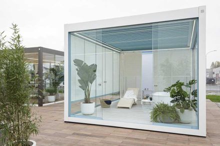-Feeling Good: by letting you take some time, immerse yourself in a space of well-being, Feeling Good offers moments of relaxation in an outdoor spa. -Dreaming: soak in the stars while feeling protected, enjoy a film, close your eyes and dream: Dreaming is the version of Imago conceived as a bedroom, a provocation that pushes the boundaries of the outdoors further than we ever thought possible.Indeed, when completely closed the Eteria's pergola metal is also water-resistant, rain water running off thanks to the gutters embedded into the beams and pillars. Its freestanding pergola also makes it ideal for seaside climates, as it resists salty air and rough weather if properly maintained.