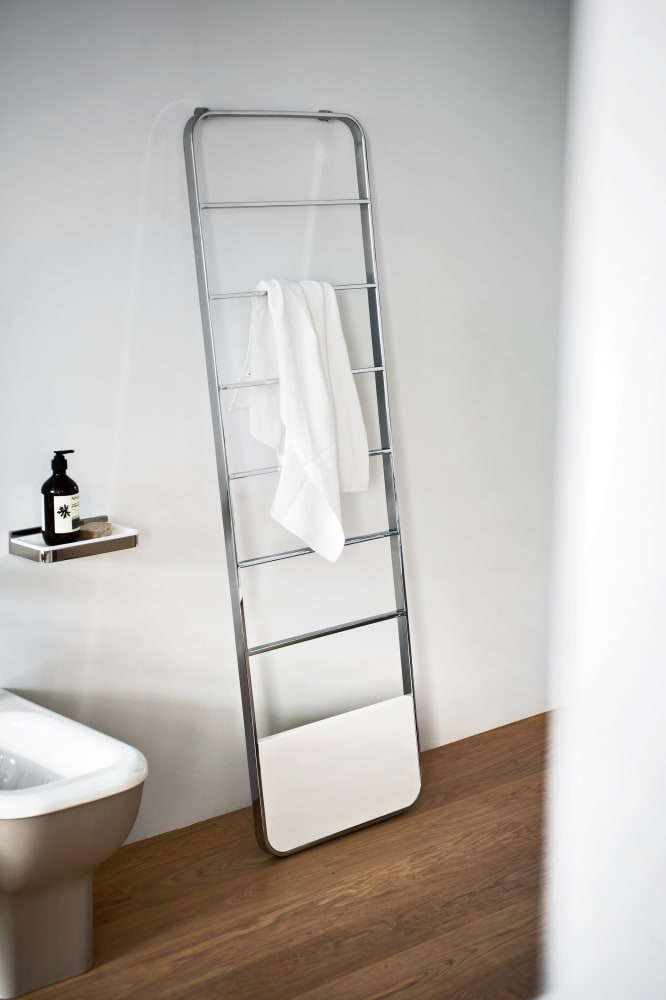 A self-regulating, heated towel rack made in stainless steel that inherits its timelessly delicate lines from the other elements of the Memory collection to which it belongs.