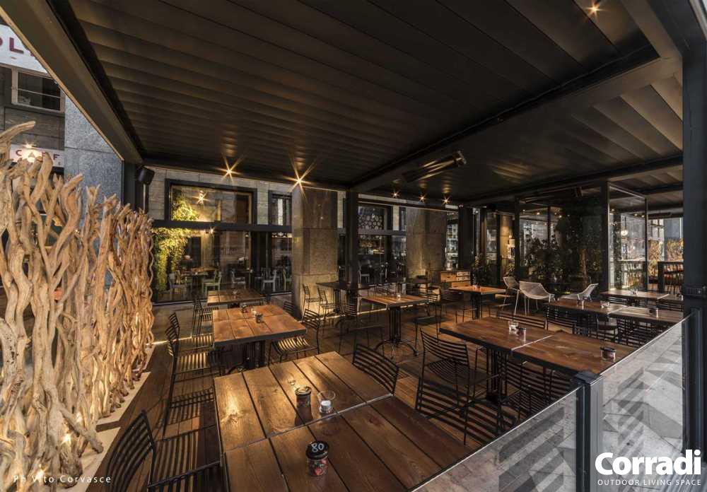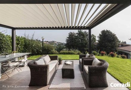 Maestro is available in all colors and finishes in the Corradi catalog and also in some interesting bicolor combinations which give the product a captivating and unexpected design. Maestro can incorporate LED lights into the blades. It is also possible to position the lights directly in the frame of the structure, creating intimate and suggestive atmospheres so that you don't have to give up living your outdoors at night.
