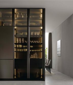 Glass tall units PR21 with doors in fumé reflecting glass and moka anodized frame; in the elements above tall unit doors with tip-on opening.