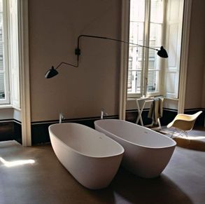 Bathtub in white Cristalplant® biobased or two colourd (exterior in dark grey RAL7021 or light grey RAL7044); with overflow hole, without tap holes; taps can be wall or floor mounted. Use of the waste with waste trap type .MET0477 or .MET0477C is mandatory (.MET0434 or .MET0477C for baths on display). The two-coloured model can be made in colours chosen by the client with a surcharge of 15% on the price of the two-coloured finish. For an easier installation of the bathtubs we recommend to use the template for the positioning of the waste trap AKITPZVAS