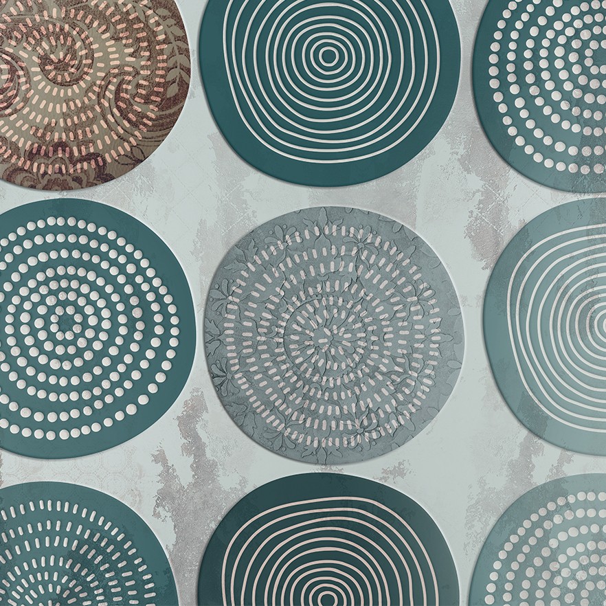 Concentric circles, spirals of various shapes, rounded elements. The eternal return, a vicious circle that gives peace.