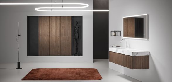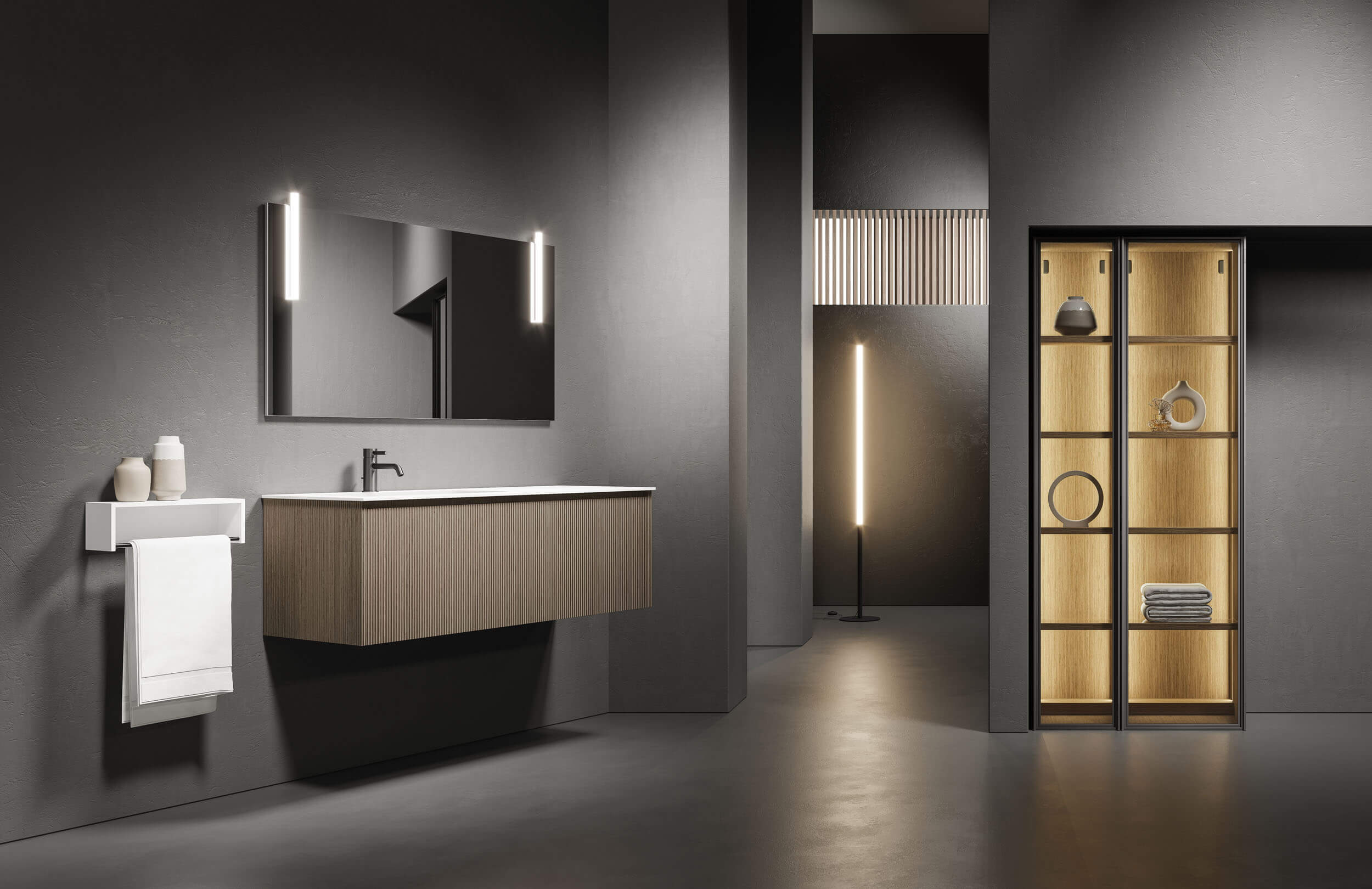 Its standout feature is the vertical milling of the wood to create a full-width groove. A finish is continued around the entire unit to create an eye-catching design flow. Full and empty spaces that create a play on light for a design that is always new and never predictable.