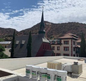 Once product is mixed, the entire container should be used. 670HS Karna-Sil Ultra may be applied by brush, roller or airless spray equipment. Apply at temperatures 50°F to 120°F. Do not apply if rain is expected within 24 hours after application. Commencement of work by the contractor implies their approval of the roof surface. See listing at www.nsf.org for application and cure instructions for rainwater catchment use.