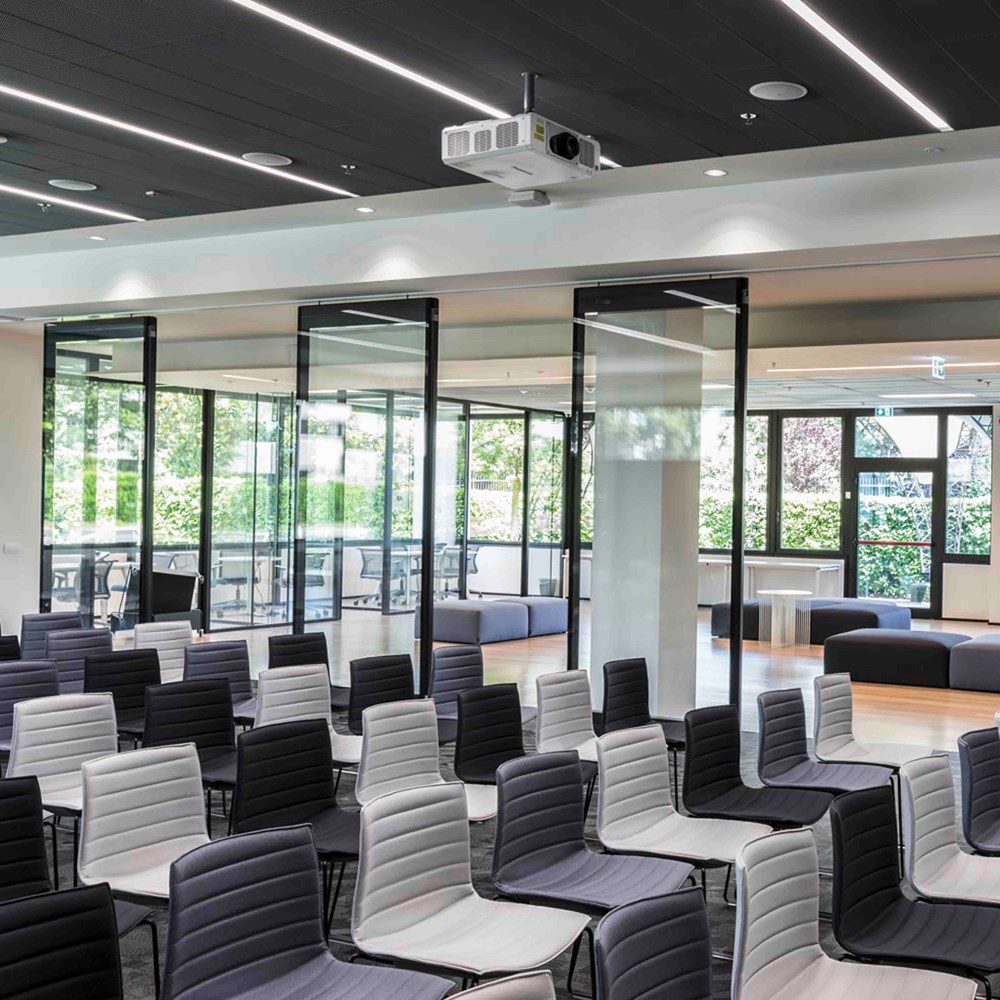 Glassstackwall > motion is an innovative system that embraces automated operation and acoustic control for swift partitioning and privacy.