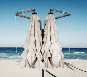 The two large Multivalvola® System canopies can be connected to each other at the edges. The mirror-polished stainless-steel structure can support the canopies either centrally or laterally, making this sunshade incredibly compact.