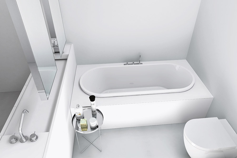 A clean-cut stylish shape characterizes the Street bathtub, consisting in a sit-on oval base integrated in an outer structure of expanded polystyrene (EPS). The edge of the bathtub protrudes from the bathtub top by about 35 mm along the entire perimeter.