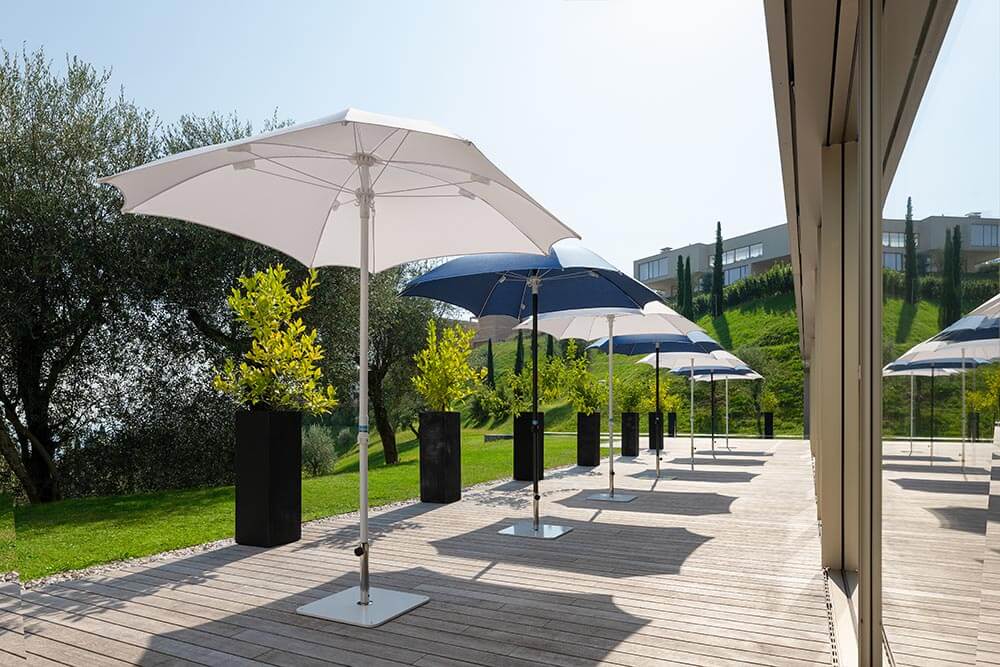 Anodized aluminium pole ø 40 mm, nylon joint with screw blocking system ø int. 38 mm, nylon components, interchangeable coat hook, 8 zinc-plated and white varnished steel ribs ø 5 mm, "Solution dyed acrylic" fabric and border, tear-proof studs.