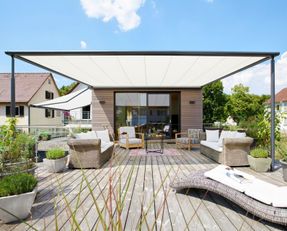When it comes to sun and weather protection, you can go big with the markilux pergola classic. The awning system on slim columns and with lateral guide tracks casts shade over a wide area with a draw of up to 6 meters. The markilux pergola classic defies wind and weather up to wind strength 6 (wind resistance class 3). With markilux shadeplus, as well as a wide range of lighting options and column variants, you have every opportunity to design your favorite outdoor space as you wish. No matter how strong the sun shines or which way the wind blows: with your markilux pergola classic you will always have peace of mind.