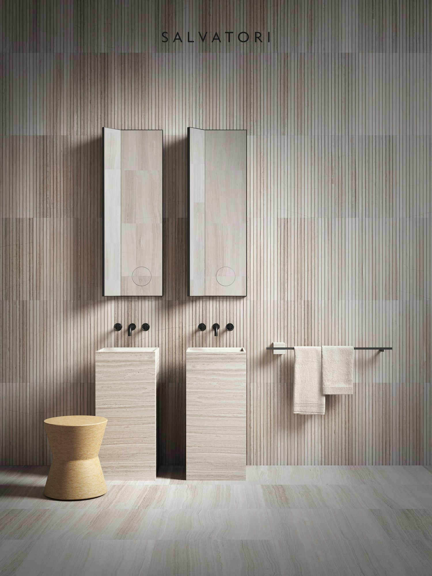 Playing with sharp lines and basic geometric shapes, the pieces add a touch of restrained glamour to any bathroom setting or kitchen setting.