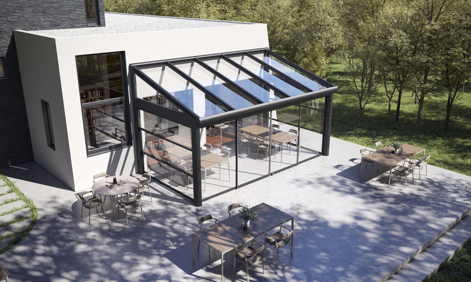Glass systems, awning systems, side walls such as Aluwall and sun breakers can be applied.