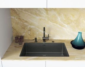 BXM 210/110-68 stainless steel, PVD coating color anthracite and nanocoating, flushmount/slimtop and undermount, 3 1/2", 1 bowl, without drainer, bowl 1 size right to left:685mm, bowl 1 size front to back:410mm, bowl 1 depth: 200mm, external size right to left:725 mm, external size front to back: 450mm, 3 1/2", with automatic waste kit and push knob color anthracite, with siphon, no tap hole, with overflow plate color anthracite, with bottom grid color anthracite, box