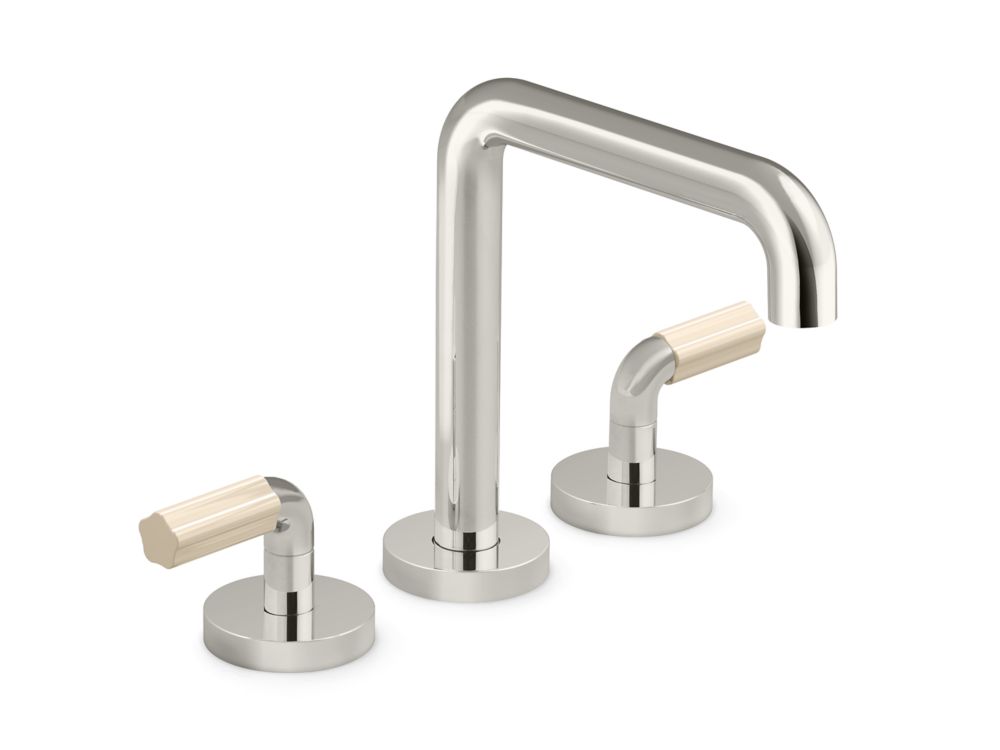 Designed for the contemporary or transitional bathroom, this premium deck-mount bathtub faucet pairs FP5 decorative handles and a tall, sleek spout with rounded angles. The FP5 handle combines the playful and eclectic sensibility of postmodern design. Its flower-shaped form and vibrant colorways add a sense of whimsy to the to the One handle's minimalist design, celebrating a memorable departure from convention.