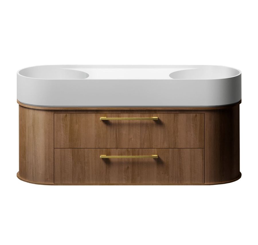 Hand made in Australia, the hand crafted 1200 curved vanity features two soft close drawers.