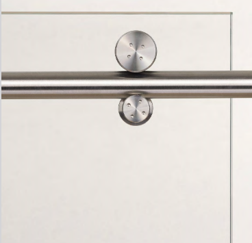 Sliding door system for 8-mm glass with visible mechanisms. The carriers and stabilisation accessories slide on a robust yet minimal track to move doors weighing up to 35 kg.